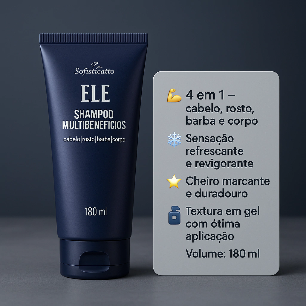 🔥 Chega de complicação! O Ele Shampoo Multibenefícios foi desenvolvido para homens que buscam praticidade sem abrir mão de qualidade. Com fórmula inovadora, ele é um cuidado completo para cabelo, rosto, barba e corpo em um único produto.