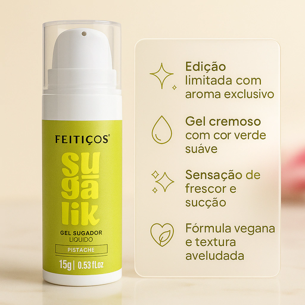 Descubra o prazer em forma de gel com o SugaLik Pistache, o sugador líquido da Feitiços que vai além das expectativas. Uma explosão de sensações com efeito pulsante, aquecido e refrescante — tudo isso com um sabor surpreendente e envolvente de pistache. 🔥💨